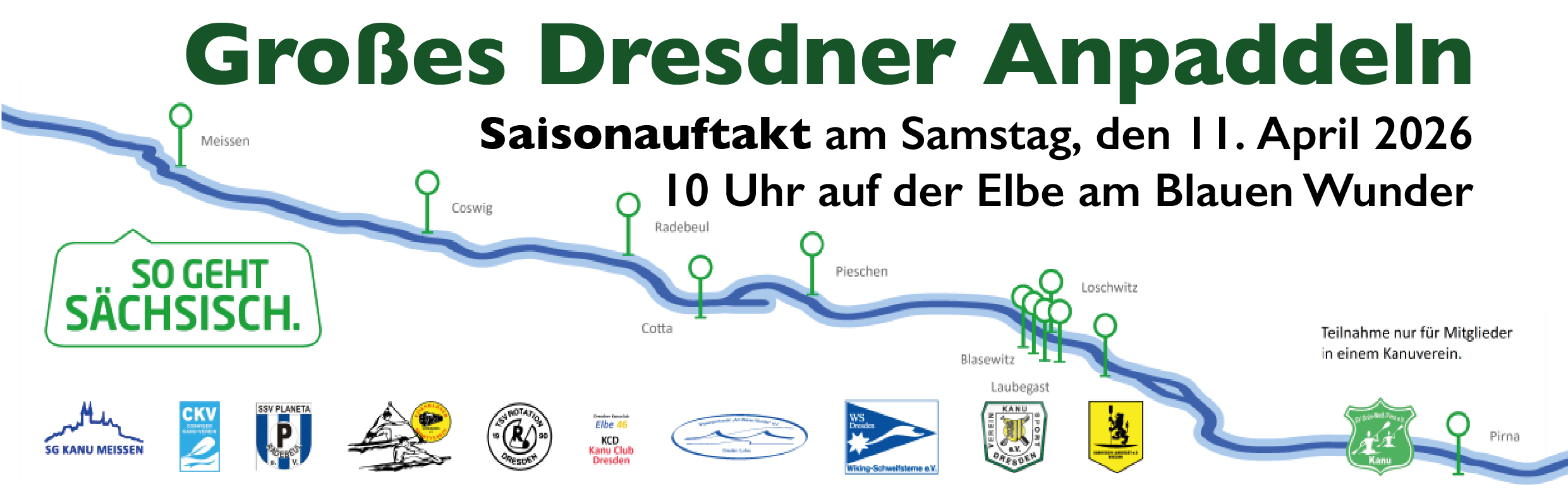 Die Fahrt ist beim Wasserstraßen- und Schifffahrtsamt Dresden angemeldet und die Wasserrettung der DRK begleitet uns. Jeder Verein trägt selbst die Verantwortung. Tragt Schwimmhilfen/ Rettungswesten. Das Wasser ist noch lausig kalt. Wechselsachen mitbringen wird empfohlen!